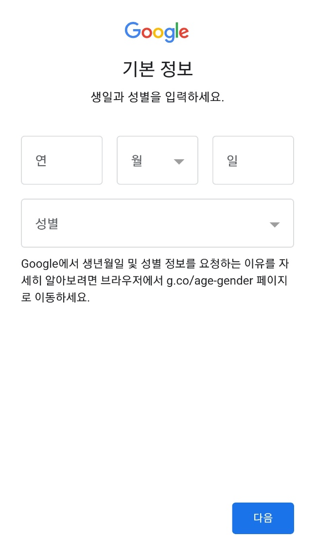 7. 생일과 성별을 입력하면 되는데, 꼭 우리의 진짜 정보와 똑같이 입력할 필요는 없다. (이것은 구글 깡동 계정이기 때문)