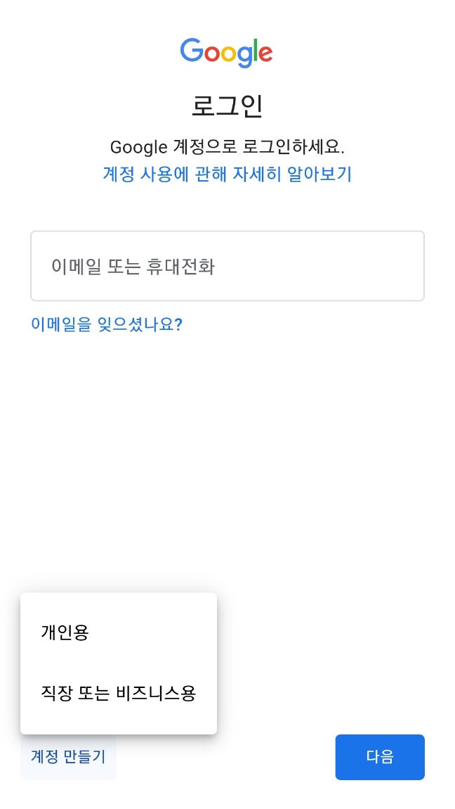 5. 이렇게 구글 로그인 페이지가 나오면, 좌측 하단에 있는 [계정 만들기] 버튼을 누르고 [개인용] 옵션을 선택해 준다.
