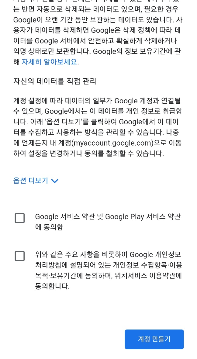 10. 마지막으로 내 구글 게정 검토를 하고, 개인 정보 보호 및 서비스 약관에 동의한 뒤 [계정 만들기] 버튼을 누르면 끝!