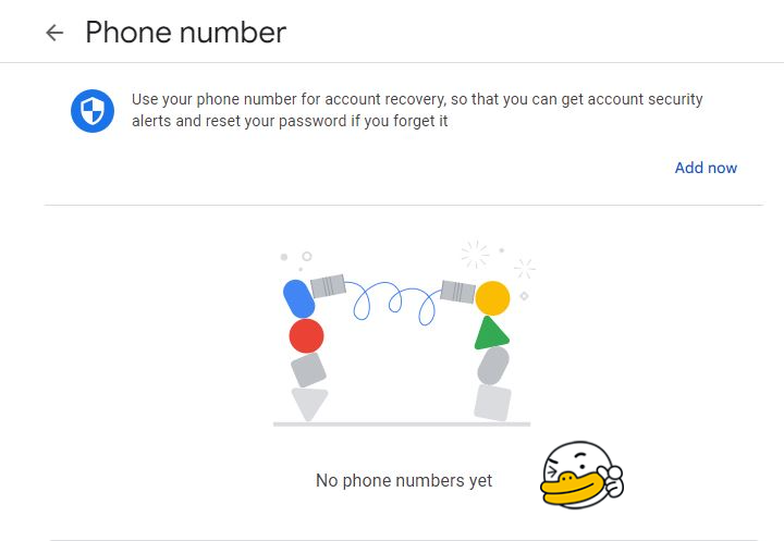 PC에서 구글 계정으로 로그인해 관지 페이지에서 전화번호를 확인해 보면 "아직 전화번호가 없습니다"라고 확인이 가능하다.
