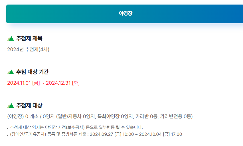 - 대피소와 야영장: 전국의 모든 야영장에 대해 연중 추첨 방식이 적용됩니다.
