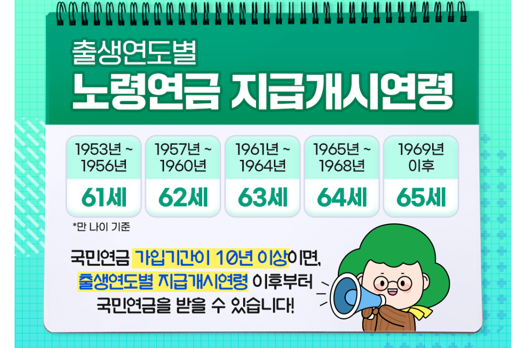 국민연금의 수령 나이는 출생 연도에 따라 달라지며, 1969년생 이후부터는 만 65세부터 수령이 가능합니다. 하지만 그 이전 세대는 점차적으로 수령 나이가 달라집니다. 기본적인 수령 연령을 확인하는 것은 매우 중요하며, 특히 아래 표를 참고하여 본인의 출생연도에 맞는 수령 나이를 확인할 수 있습니다.