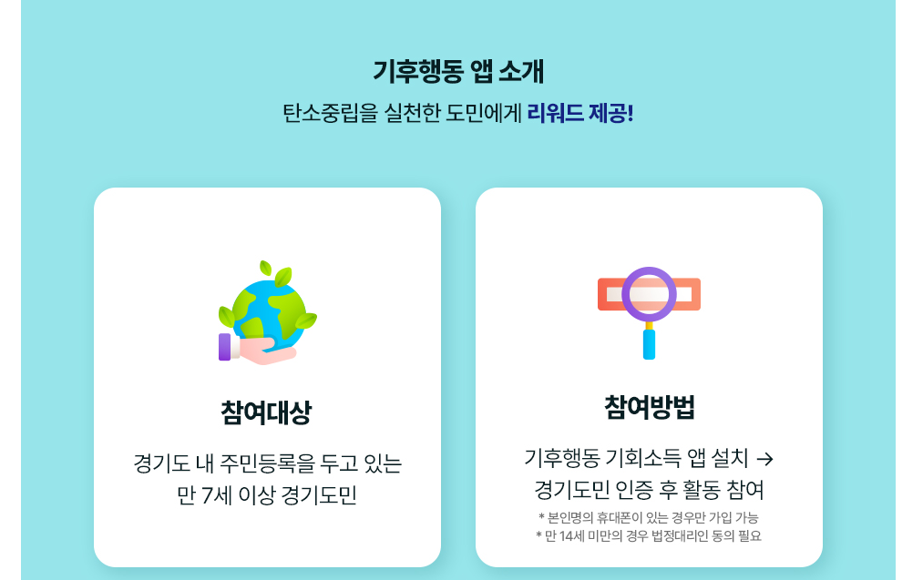 기후행동 기회소득은 경기도에 주민등록이 되어 있는 만 7세 이상의 경기도민이라면 누구나 참여할 수 있습니다. 단, 만 14세 미만은 법정 대리인의 동의가 필요합니다.