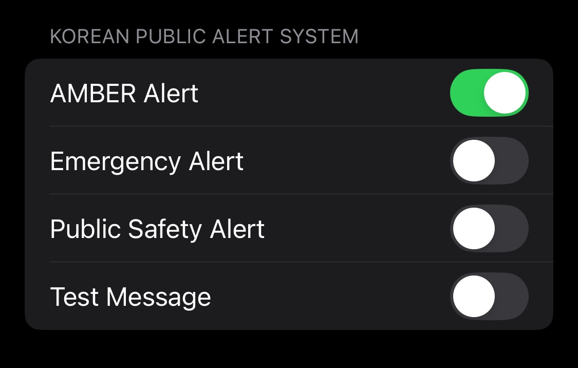 - '실종경보문자', '긴급재난문자', '안전안내문자' 항목의 스위치를 조정하여 개별적으로 설정할 수 있습니다.
