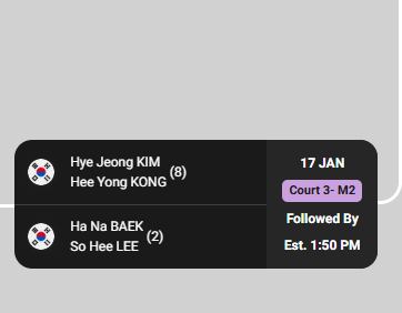 - 대결 상대: Jia Min Yeo (싱가포르, 세계랭킹 13위)