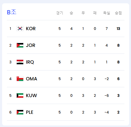 월드컵 아시아 3차 예선 조별 순위 및 5~6차전 경기 프리뷰