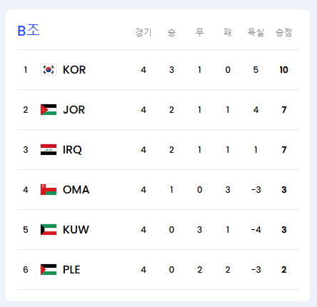 현재 한국은 B조에서 승점 10점을 기록하며 선두에 자리하고 있습니다. 그러나 남은 경기 결과에 따라 순위가 변동될 수 있어 방심은 금물입니다.