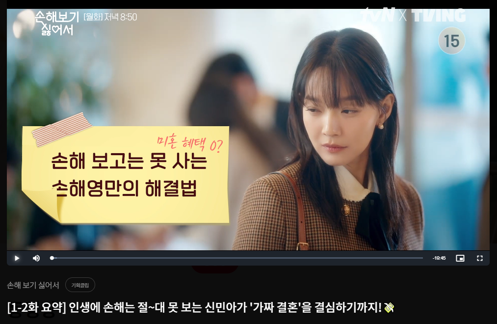 월화 드라마 '손해 보기 싫어서'는 티밍 오리지널 시리즈로 재방송은 티빙에서 볼 수 있습니다. 첫 방영을 놓치셨다면 지금 바로 TVING에서 확인해 보세요!