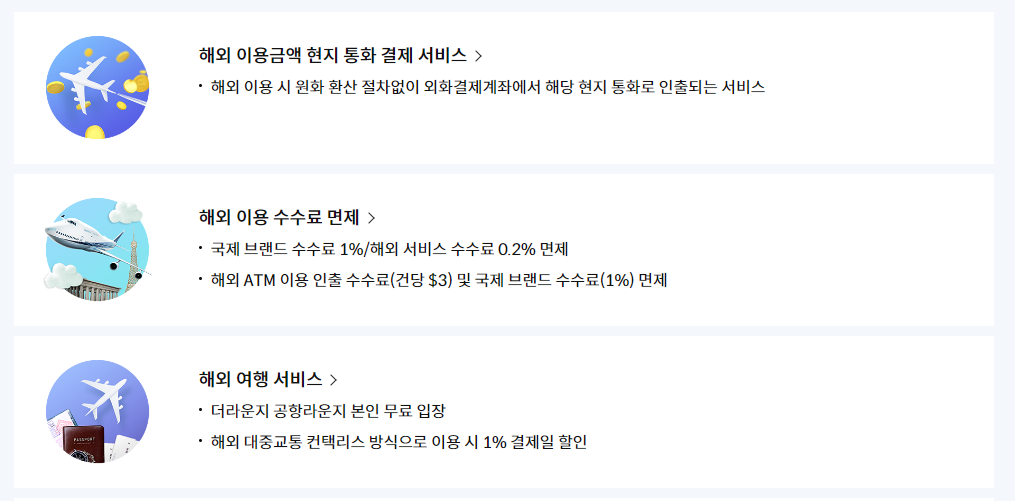 이외에도 해외 결제 시 수수료 면제 혜택이 제공되며, 대중교통 이용 시 1% 할인, 편의점에서도 5% 할인을 받을 수 있어 일상적인 사용에도 유용합니다.