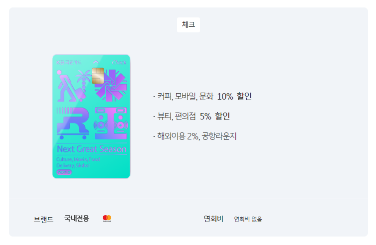 국민 노리2 체크카드(Global)는 라운지 이용뿐만 아니라 다양한 일상 혜택을 제공합니다. 특히 스타벅스, 편의점, 배달앱 할인 혜택이 많아 생활비 절감에도 효과적입니다. 연 1회 공항 라운지 이용이 가능하지만, 국내외 여러 분야에서 할인을 제공해 다목적으로 사용하기 좋은 카드입니다.