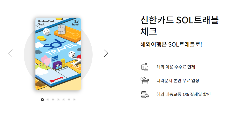 신한카드의 SOL 트래블 체크카드는 이름에서 알 수 있듯이, 해외여행에 최적화된 카드입니다. 연 2회 인천공항 라운지를 무료로 이용할 수 있어 여행이 잦은 분들에게 특히 유리합니다.