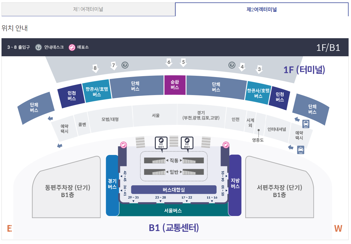 - 위치: 제2여객터미널의 리무진 버스 승차장은 교통센터 지하 1층에 있습니다.