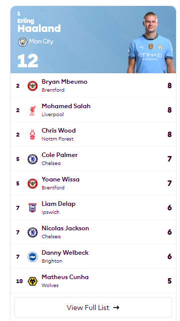 엘링 홀란드(맨시티)가 득점 선두를 달리고 있으며, 노팅엄의 크리스 우드가 그 뒤를 따르고 있습니다. 이번 시즌도 홀란드의 압도적인 득점 페이스가 이어질지 주목됩니다.
