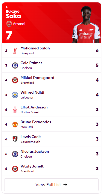 아스널의 부카요 사카는 7개의 도움으로 리그 도움 선두를 기록 중입니다. 토트넘의 손흥민 역시 3개의 도움을 기록하며 꾸준히 팀에 기여하고 있습니다.