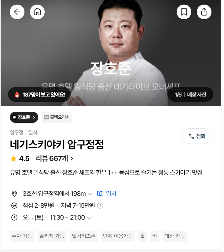 - 특징: 장호준 셰프는 일식 스키야키 요리의 달인으로 알려져 있으며, 네기 스키야키에서 고품질의 일본식 코스를 선보이고 있습니다. 이곳에서는 장어 덮밥, 소바 등 다양한 일식 요리도 함께 즐길 수 있습니다.