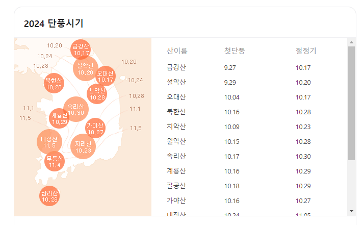 9월 29일 첫 단풍, 10월 20일 절정. 설악산은 단풍 명소 중 가장 유명한 곳으로 매년 많은 관광객이 방문합니다. 울산바위와 비룡폭포 주변 코스는 단풍과 함께 자연의 경관을 즐기기에 최적입니다.