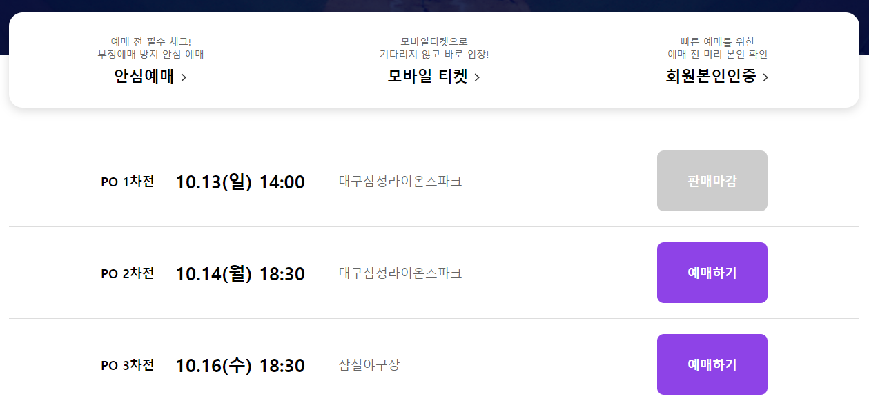 포스트시즌 티켓 예매는 인터파크 티켓을 통해 주로 이루어집니다. 티켓은 경기가 다가올 때마다 단계별로 오픈되며, 대개 경기 3~5일 전에 판매가 시작됩니다. 예매 성공을 위한 팁 몇 가지를 소개합니다: