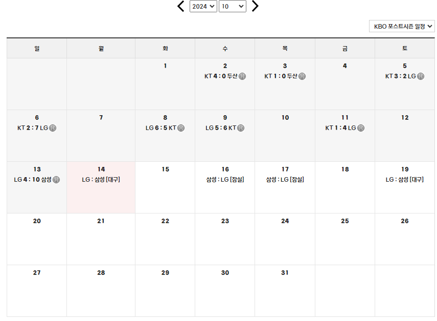 - 1차전: 10월 13일 (일) 오후 2:00, 대구 삼성 라이온즈 파크