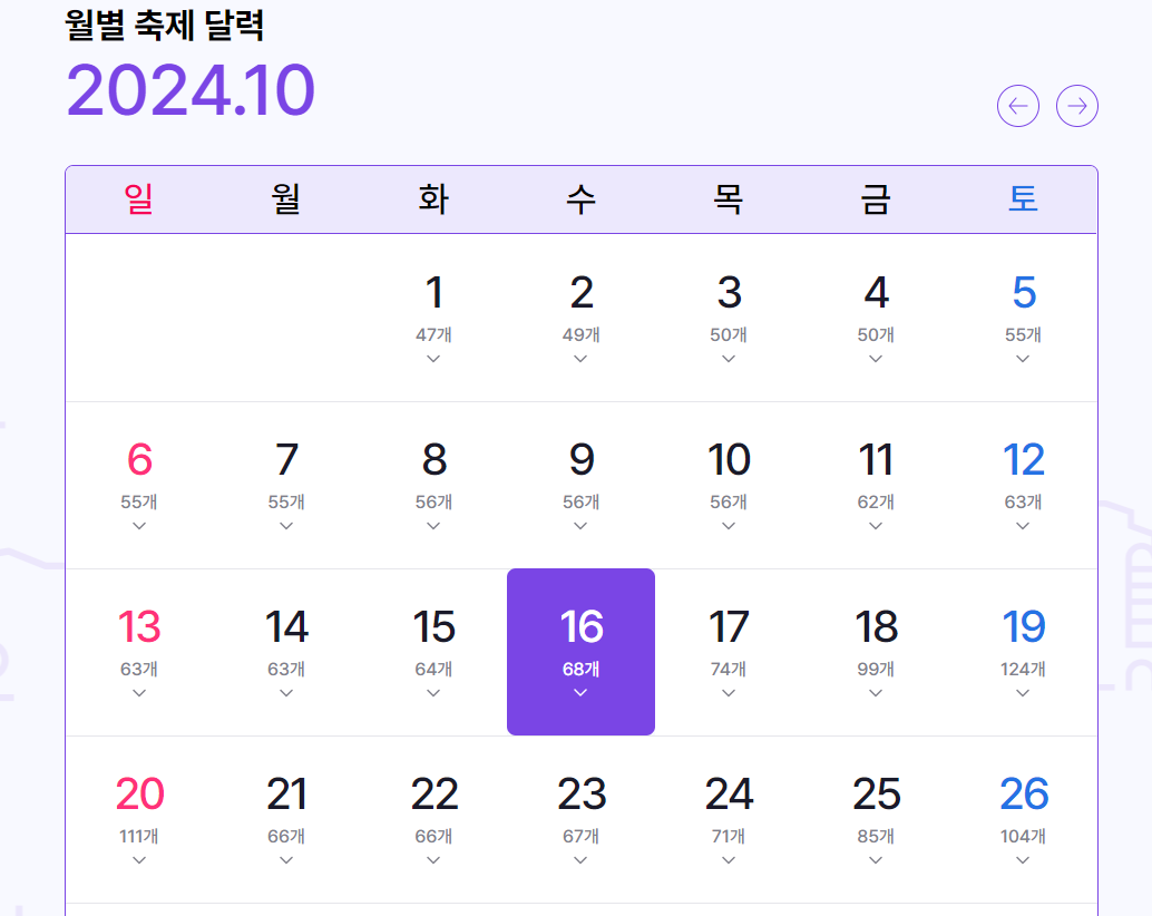 전국적으로 축제가 매월 그리고 매일 진행되고 있다는 것 아셨나요? 아래 링크를 클릭해서 원하는 날짜를 선택한 후, 진행되고 있는 축제를 확인할 수 있습니다.