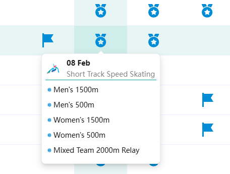 | 2월 8일(토) | 쇼트트랙 500m, 1500m 결승, 스노보드 슬로프스타일 예선 |