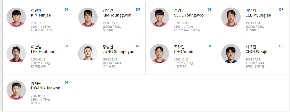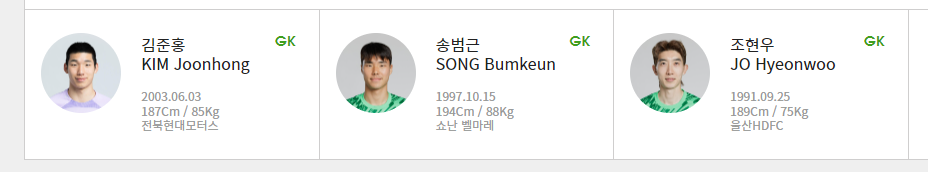- GK (골키퍼): 조현우(울산 현대), 송범근(쇼난 벨마레, 일본), 김준홍(전북 현대 모터스)