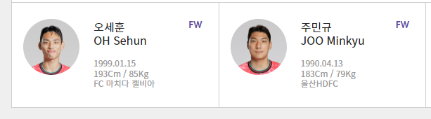 - FW (공격수): 주민규(울산 현대), 오세훈(마치다 젤비아, 일본)