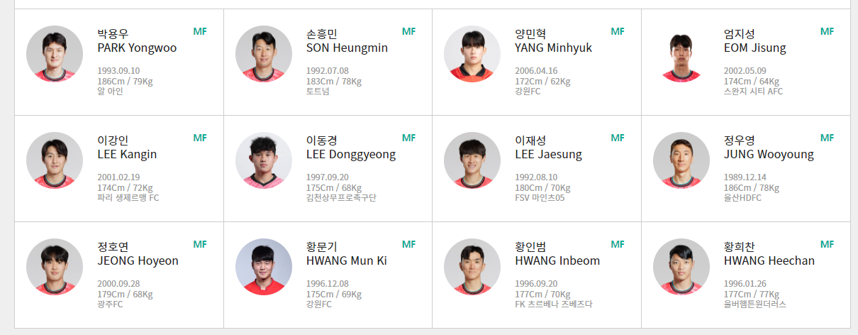 - MF (미드필더): 박용우(알아인, UAE), 정우영(울산 현대), 황인범(즈베즈다, 세르비아), 이재성(마인츠 05, 독일), 손흥민(토트넘 홋스퍼, 잉글랜드), 황희찬(울버햄프턴 원더러스, 잉글랜드), 이동경(김천 상무), 정호연(광주 FC), 양민혁(강원 FC), 엄지성(스완지 시티, 웨일스), 이강인(파리 생제르맹, 프랑스)